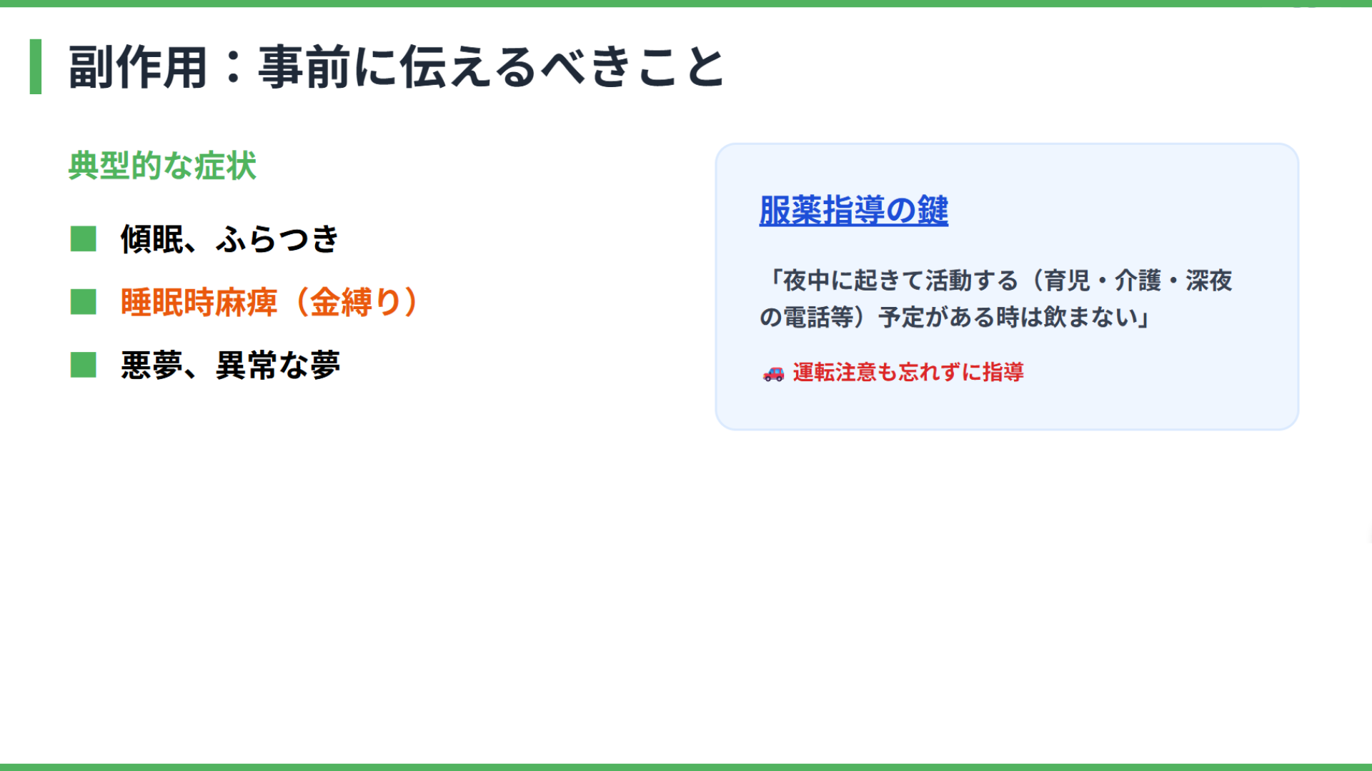 副作用として、悪夢や睡眠時麻痺(いわゆる金縛り)が起こりうることをあらかじめ説明し、そのような症状が出た場合には、自己判断で中止せず、医師に伝えるよう指導しておきましょう。