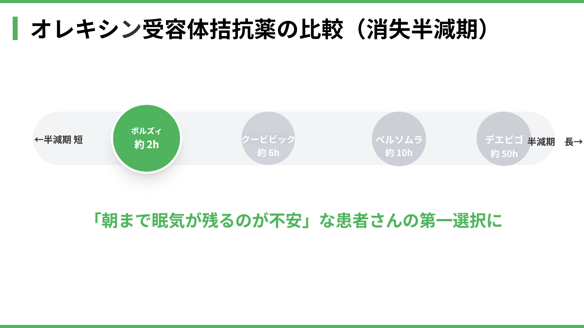 ボルズィ錠は、DORA(デュアルオレキシン受容体拮抗薬)としてベルソムラ、デエビゴ、クービビックと同じ作用機序のグループに入ります。オレキシン受容体拮抗薬の中で最も短い半減期を持つのがボルズィ錠であり、消失半減期は約2.13時間と示されています。