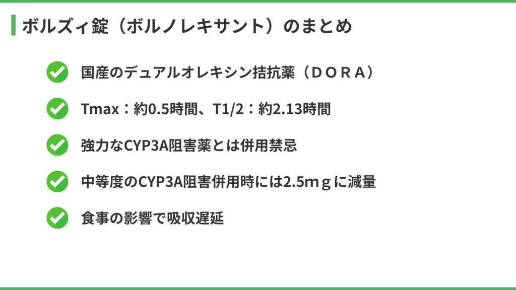 ボルズィ錠は短い半減期を持つ国産DORAで、相互作用と服用指導が重要。