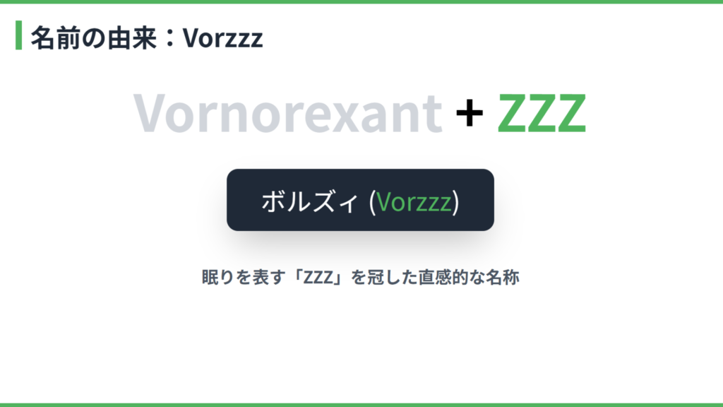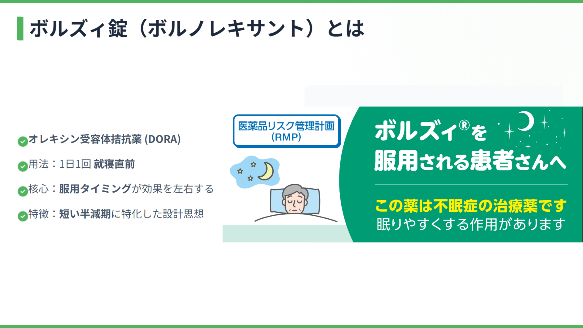 なお、「ボルズィ」という名称は、インタビューフォームで「一般名のボルノレキサントと、眠りを表すZZZから命名した」と説明されています。