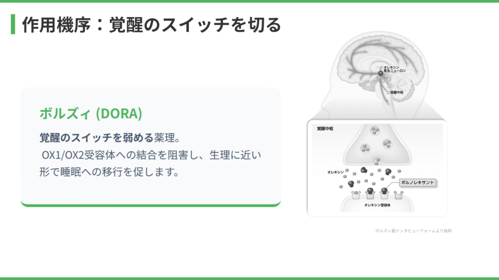 ボルズィ錠はオレキシン受容体拮抗薬。覚醒系を弱め、生理に近い睡眠移行を目指す。