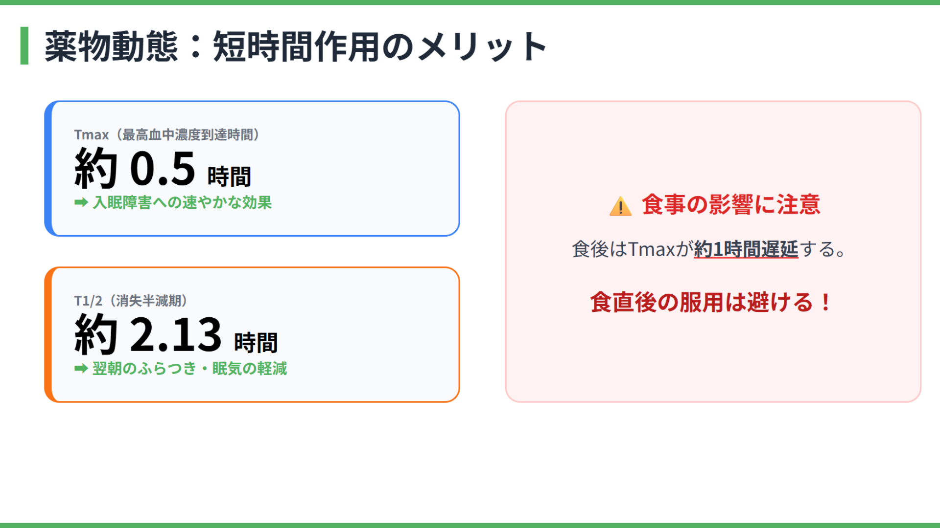 この速さは、作用発現が早く、翌朝への眠気の持ち越しが少ないという利点につながると整理されています。一方で、食事は吸収のタイミングを遅らせます。健康成人で食後投与では、Tmaxの中央値が約1時間遅延したことが示されており、食事と同時、または食直後の服用は避けることとされています。