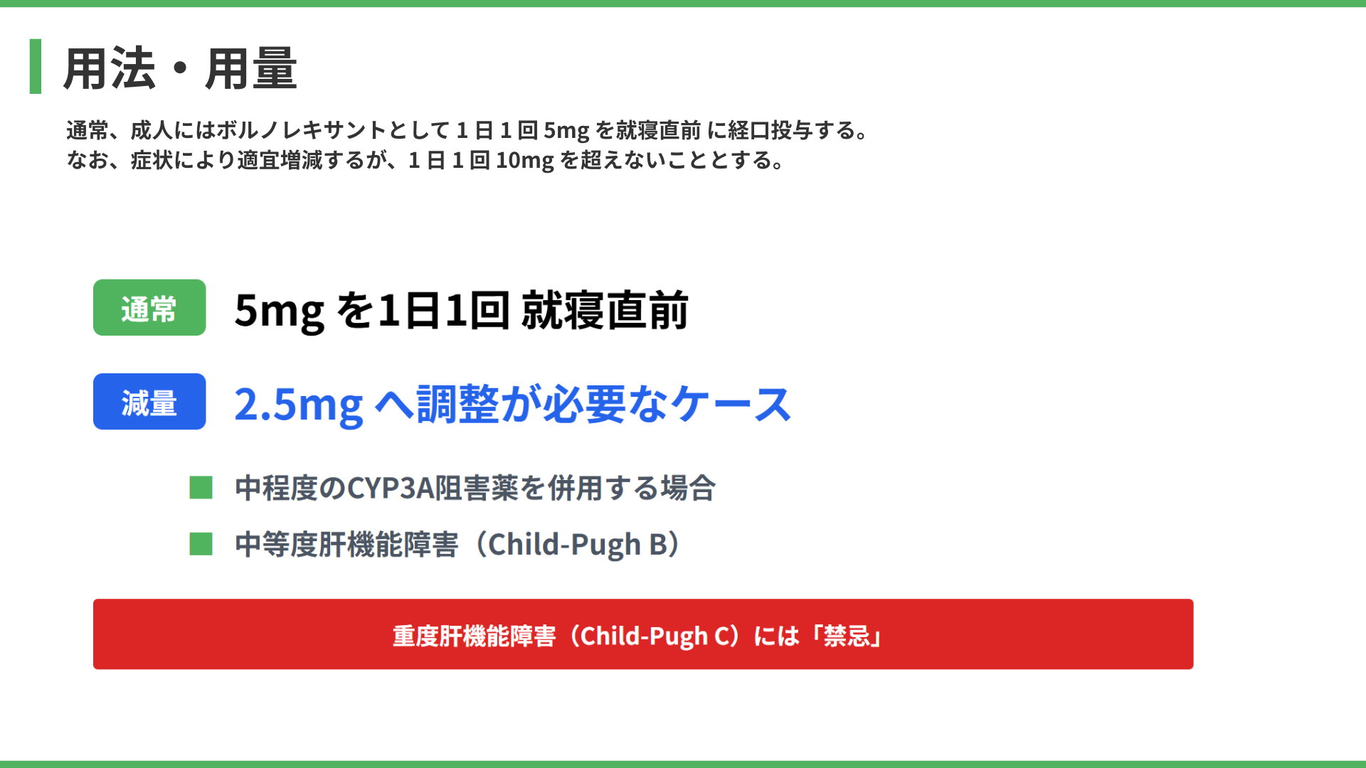 通常、成人にはボルノレキサントとして1日1回5mgを就寝直前に経口投与し、症状により適宜増減します。ただし、1日1回10mgを超えないことが明記されています。増量時は傾眠など副作用が増える可能性があるため、観察しながら慎重に進め、改善に伴って減量に努めることとされています。