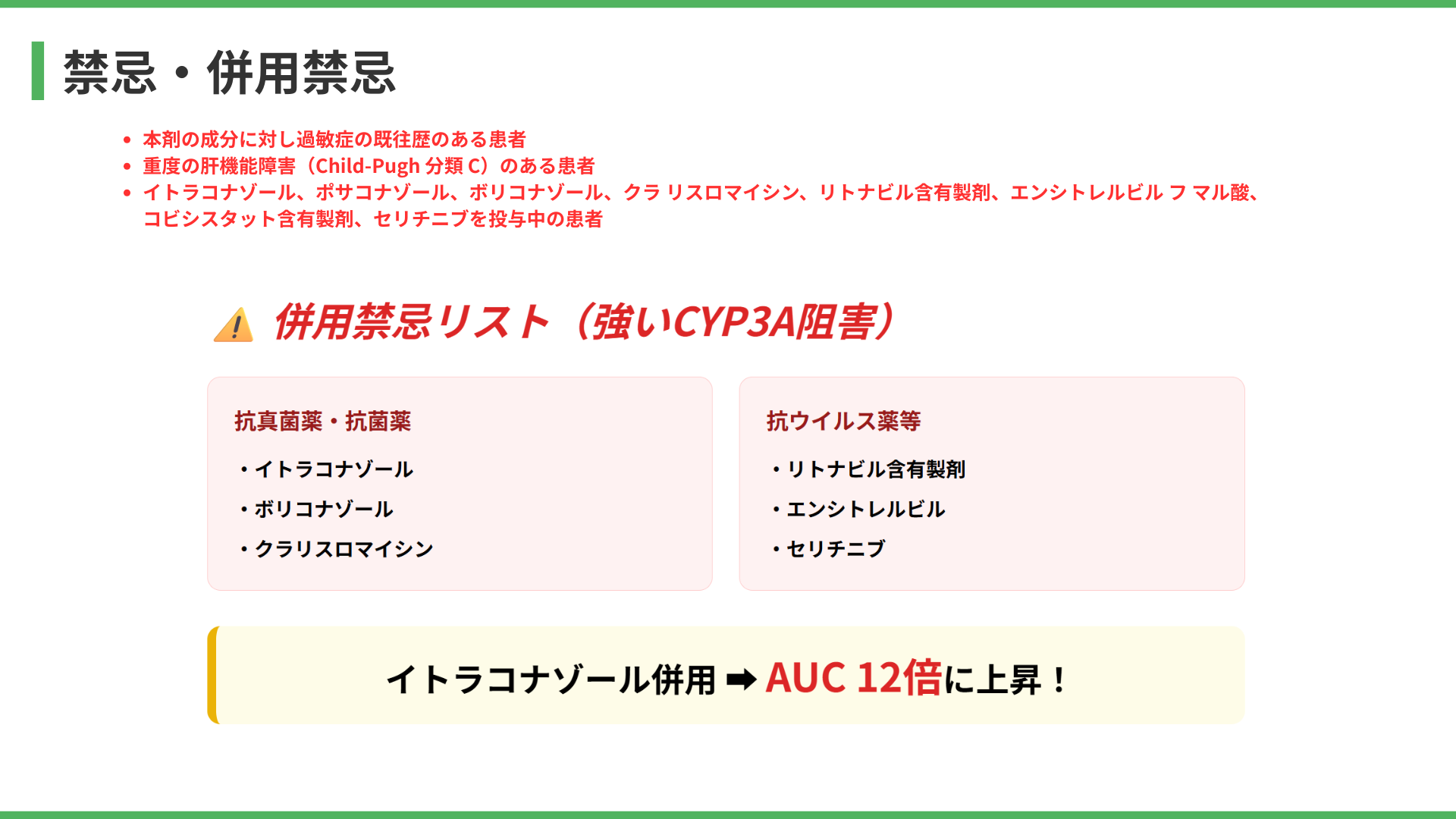 相互作用の観点では、イトラコナゾールやクラリスロマイシンなどの強力なCYP3A阻害薬とは併用禁忌です。