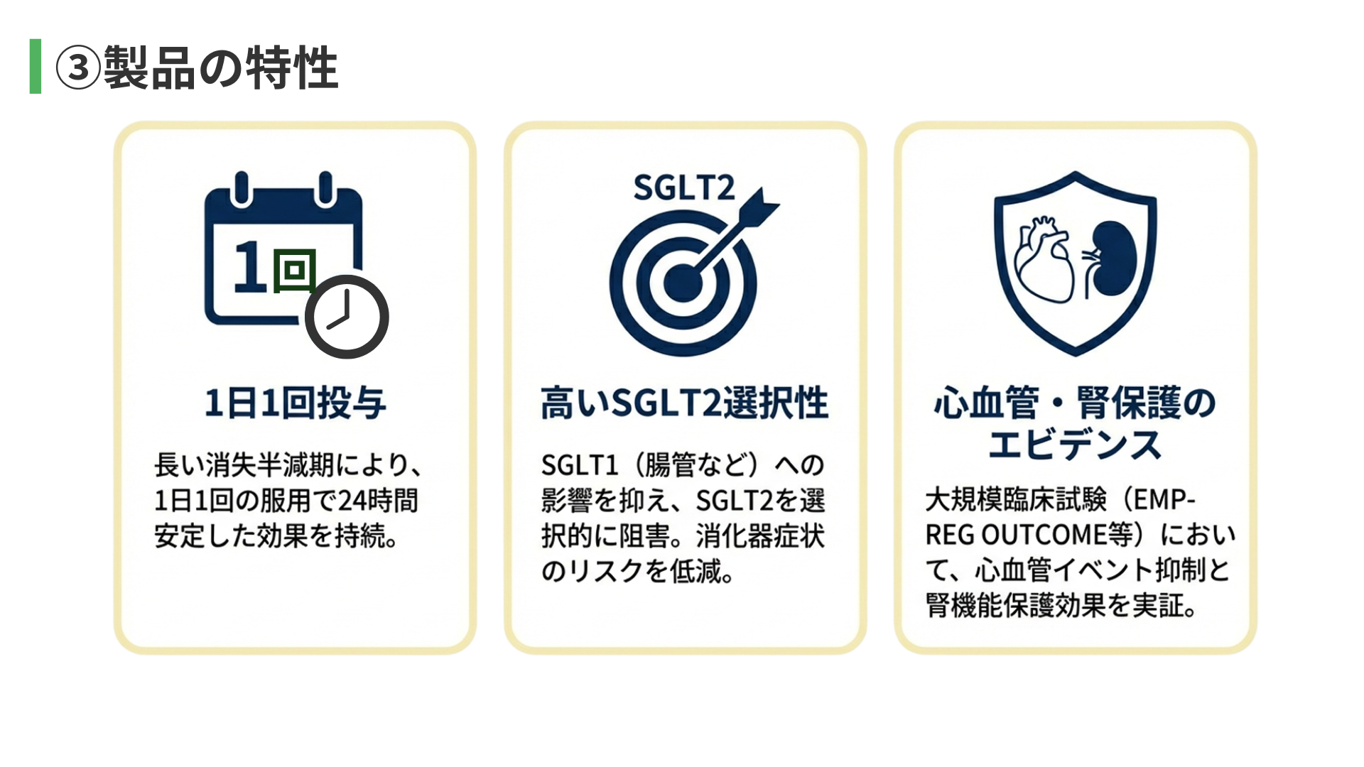 現代人が注意したい「糖尿病」「心臓病」「腎臓病」という大きな3領域に関わる薬として語られており、ここが服薬指導での説明軸にもなります。
