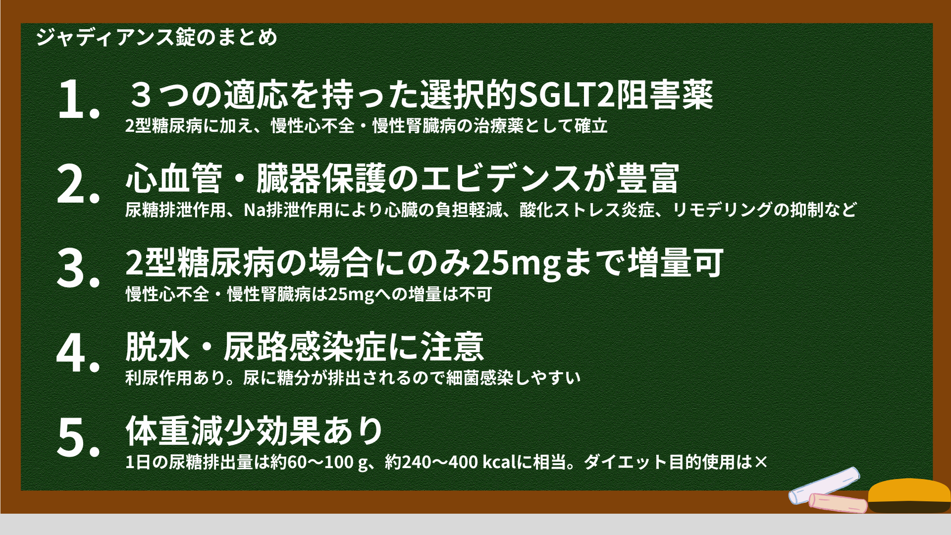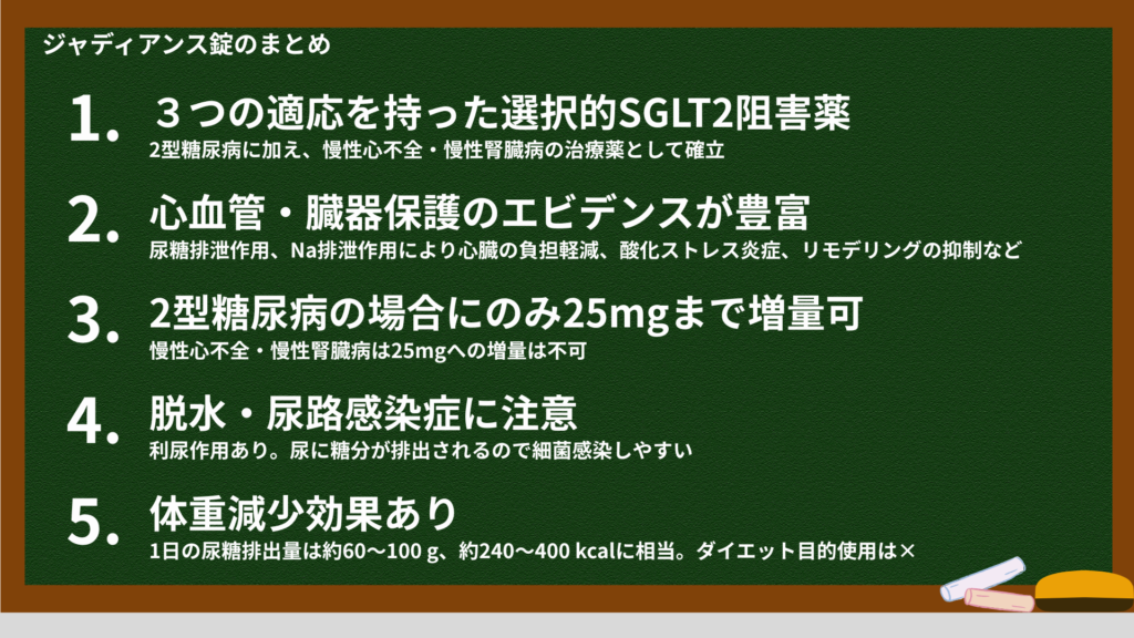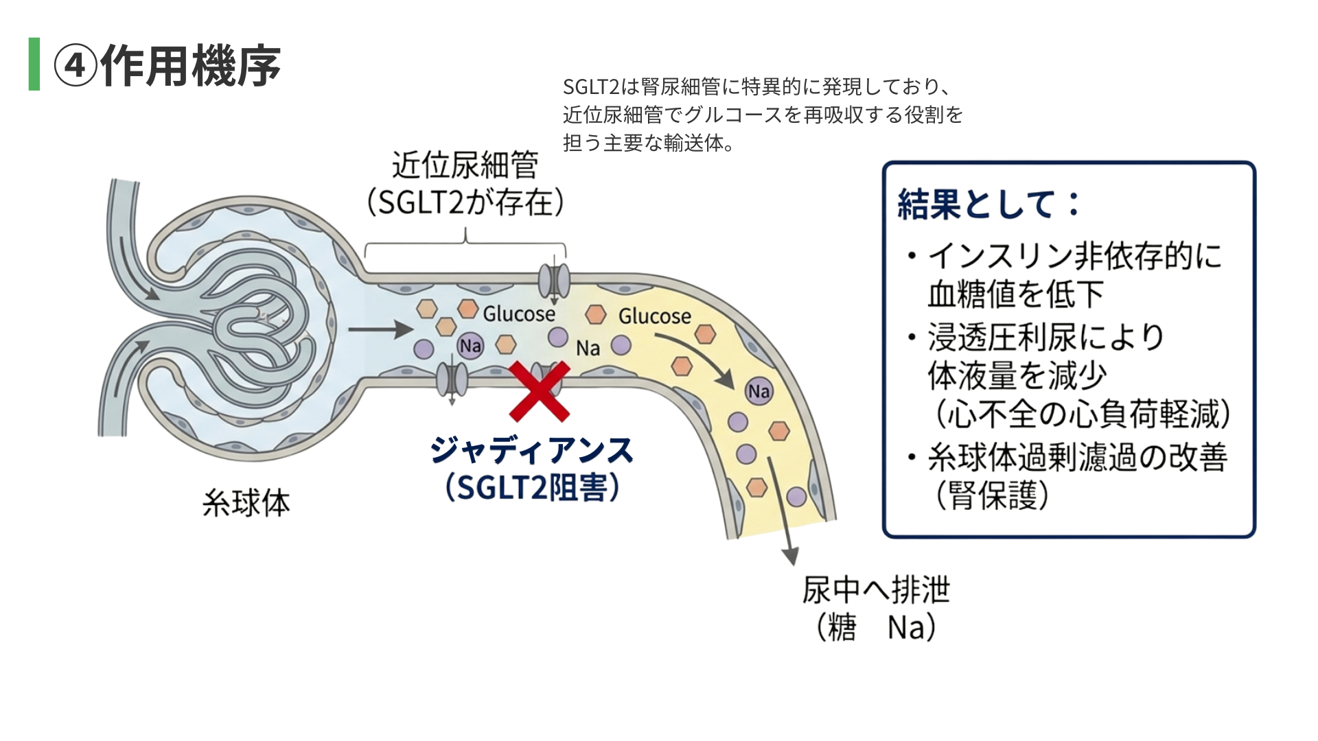ジャディアンス錠は、尿中への糖排泄による血糖低下だけでなく、心臓と腎臓の観点でも語られる薬として位置づけられています。