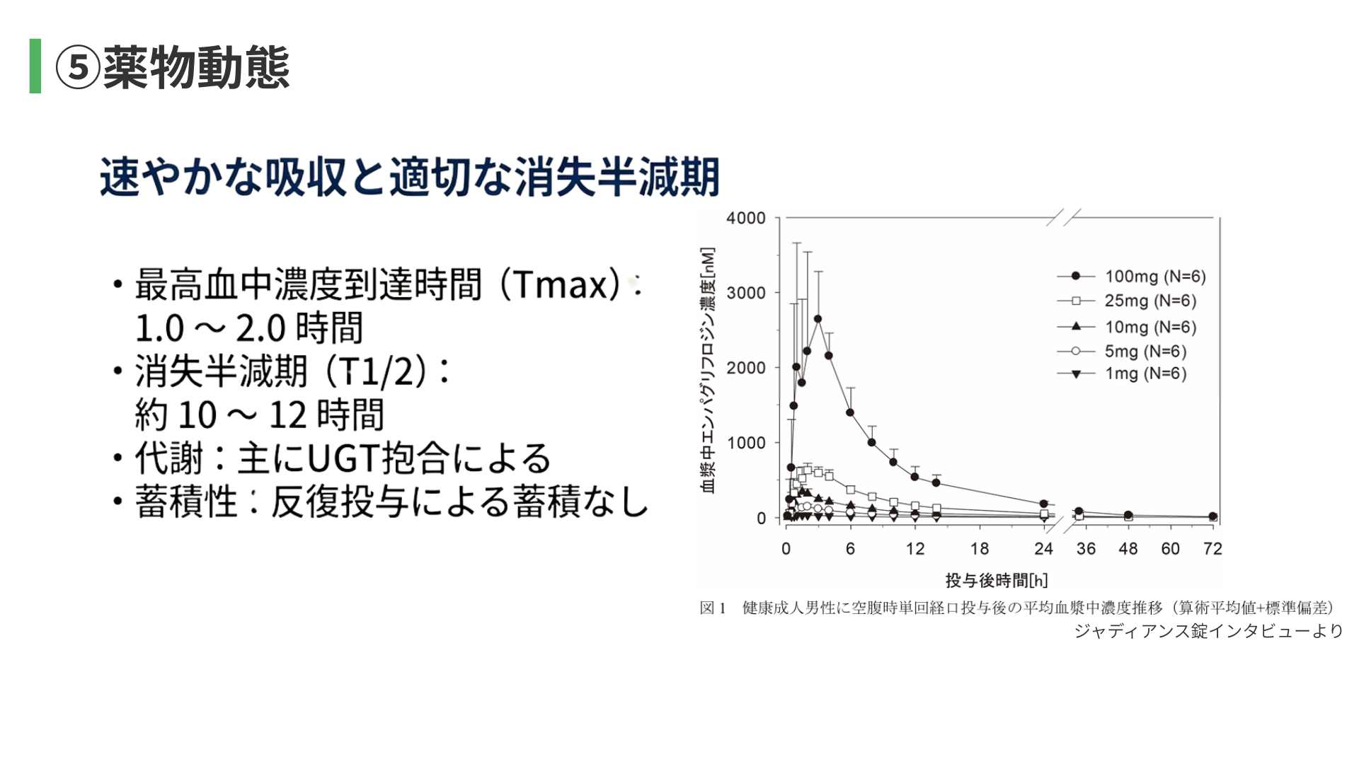 ジャディアンス錠の半減期は10〜12時間であり、1日1回服用で24時間効果が持続。