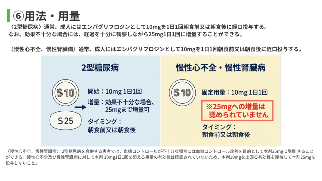 用量面では、2型糖尿病の場合に限り25mgまで増量が可能とされる一方、慢性心不全・慢性腎臓病の用量は10mgが基本で、25mgへの増量は想定されていない点がポイントになります。