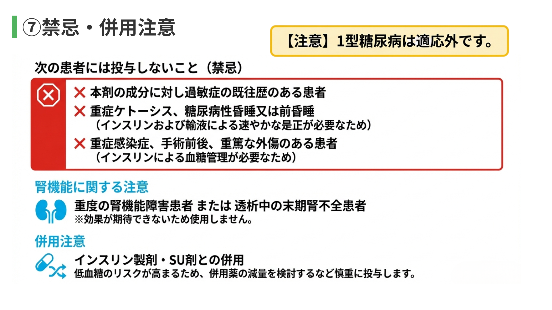 なお、本剤には体重減少効果があり、1日の尿糖排出量は約60〜100gで、約240〜400kcalに相当します。一方で、ここが独り歩きすると危険なため、適応外のダイエット目的使用は避けるべき、という前提を繰り返し共有する必要があります。