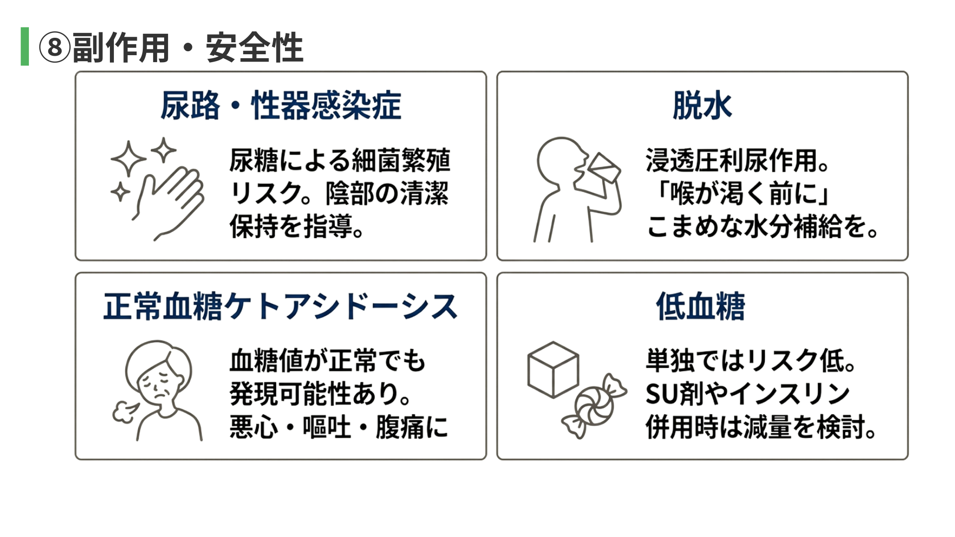 安全性では、尿路・性器感染症、脱水、正常血糖ケトアシドーシスに注意が必要とされ、特に脱水予防として「喉が渇く前に」水分を摂る指導が重要です。