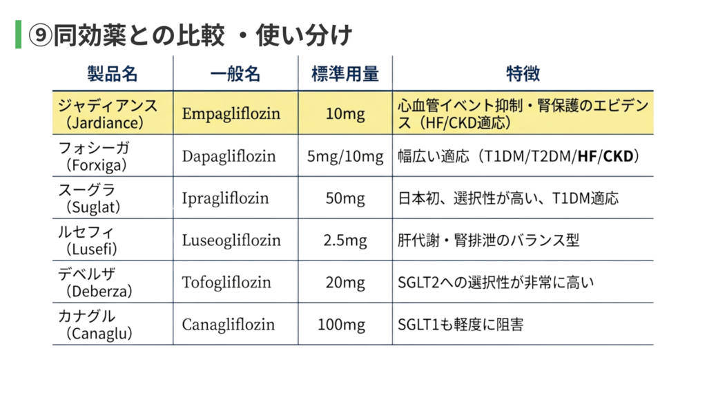 ジャディアンス錠はSGLT2選択性と心腎エビデンスが強み。