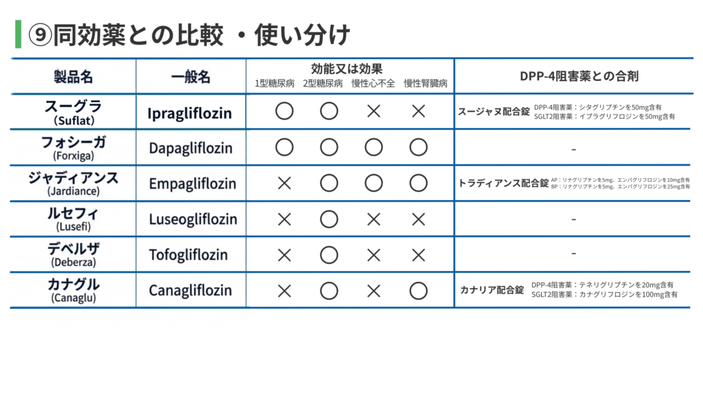 本剤は選択的SGLT2阻害薬に分類されますが、理解の最大のポイントは「適応が2型糖尿病だけではない」点です。